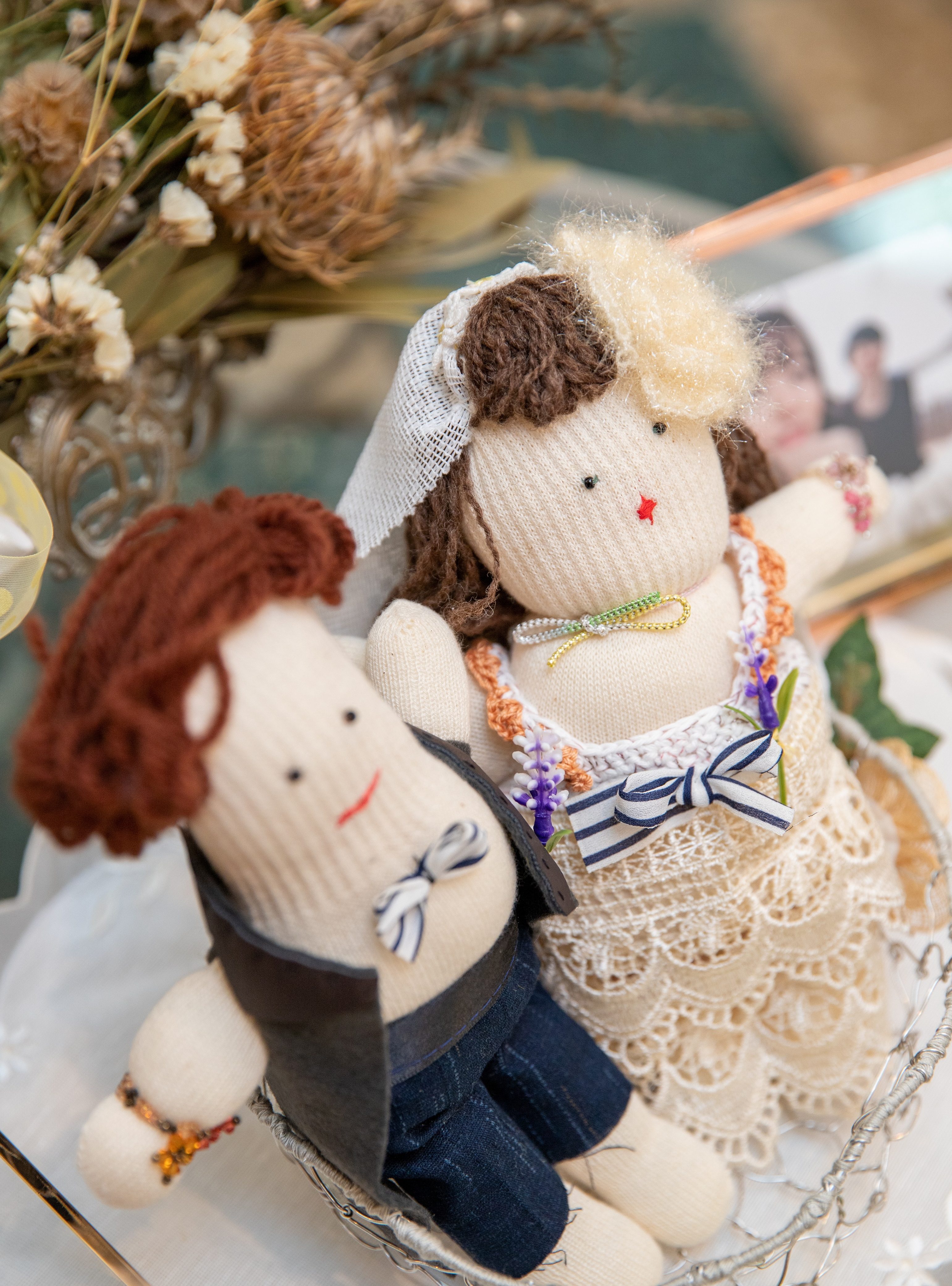 実は、花嫁様のお母様の手作りで、お人形のボディは「手袋」なのだそう(びっくり!)。愛嬌のある表情がとっても可愛らしいですよね!